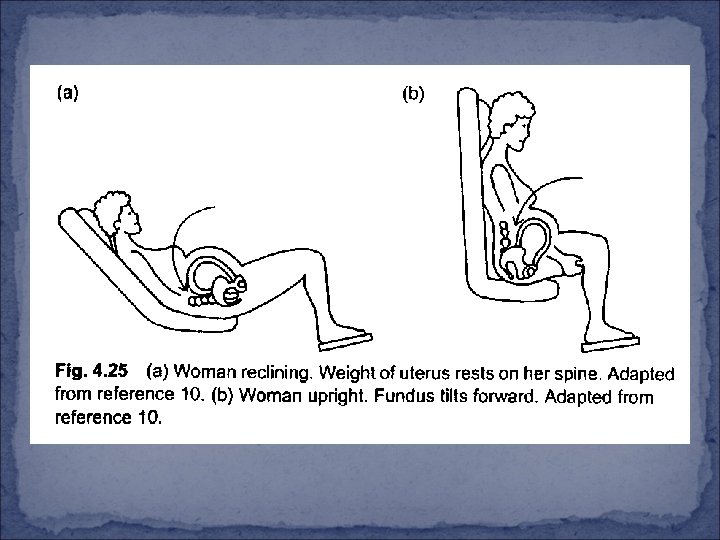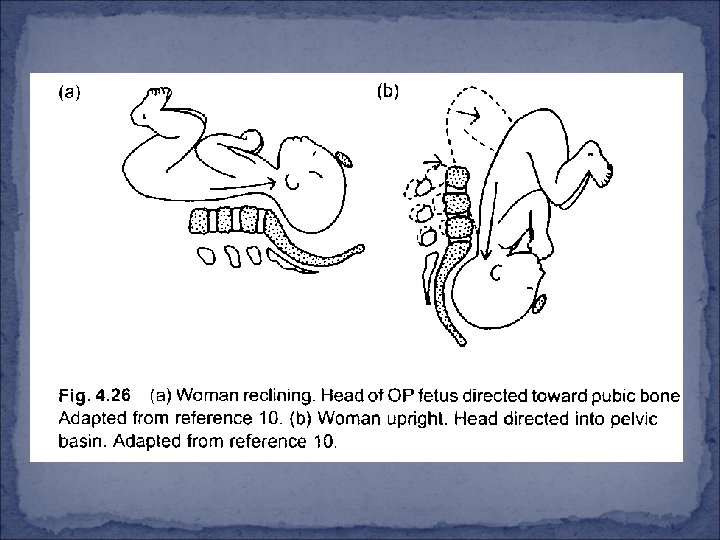 Note regarding supine and semi-sitting positions for occiput posterior When a woman is fully supine or semi-sitting, gravity encourages the trunk of the Op fetus to lie next to the woman ‘s spine, increasing the changes of supine hypotension, but also minimizing the likelihood or rotation to OA. These positions also increase the pressure of the fetal occiput against the woman ‘s sacrum, thus worsening her back pain (Fig. 4. 25 a). There is a much greater likelihood of rotation, and less back pain when the woman sits upright or leans forward. (Fig. 4. 25 b). When a woman is supine, the head of an occiput posterior fetus is directed more toward the pubic bone during contraction (Fig. 4. 26 a). When the woman is upright, the uterus, tilting forward, direct the fetal head into the pelvic basin (Fig. 4. 26 b).