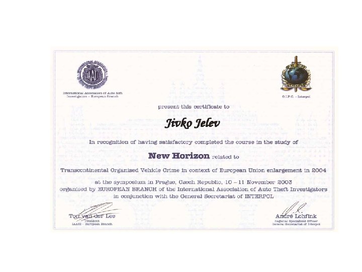 Database Information of the vehicle’s owner (name, address, ID card number, etc. ), vehicle’s data (VIN, engine number, registration number, etc. ), marking code and additional information (date of marking, place and station code, etc. ) is put down in the database that is recorded on the CD-ROM (avoiding unauthorised or fraudulent corrections) and is given to the relevant bodies (Police, insurance companies, etc. ), which are involved in the fight against vehicle’s thefts and crimes. During the routine check Police officer or Traffic warden carry out the instant control by verifying the information with that in the central database. For its database KEIT LTD received Golden Badge from Scotland Yard in 1994. We have an agreement with Bulgarian National Police Directorate for utilisation of our database and marking for tracking and discovering of stolen motor vehicles.