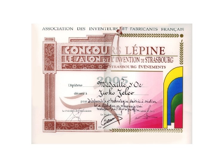 Conclusion The results are remarkable! On the base of more then 500 000 marked vehicles thefts are more than six times less over against the same number nonmarked ones: about 45% of stolen marked cars have been discovered until now. The information data base for the marked vehicles is recorded on a multimedia optical disk which is used by the police during the search. The information, recorded on such disk (CD-ROM) can not be erased, infected by viruses, hanged or counterfeited. The marking price includes the information service during a year term. Our good relations with Athena, Rotterdam and Warsaw provide for the successful search of all cars marked in Bulgaria both in and outside our country. Our company owns internationally adopted patents for multimedia multistage encrypted marks. The "Secury. Mark" technology is laid down by the policies early as in 1993. In 1994, at the International Conference with the participation of Bulgarian Ministry of Interior and Interpol we were given with golden badge by the representative of Scotland Yard. On the base of contracts made with us, the biggest Bulgarian insurance companies (like the State Insurance Institute, BULSTRAD, Bul. Ins, Bulgarski Imoti - Wiener Stadtische Group etc. ) demand, and the rest of them recommend their costumers to mark the insured vehicles.