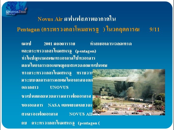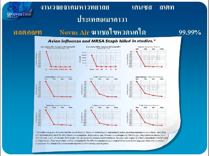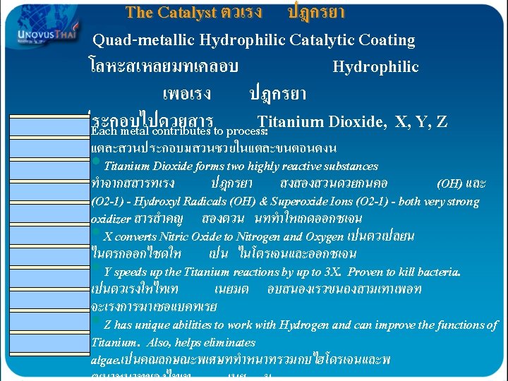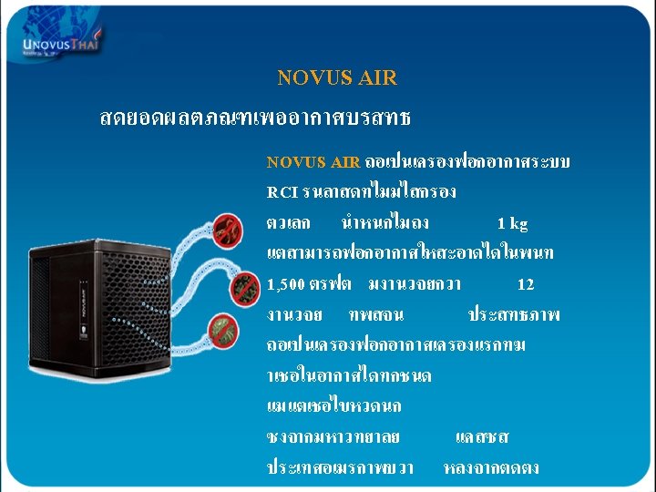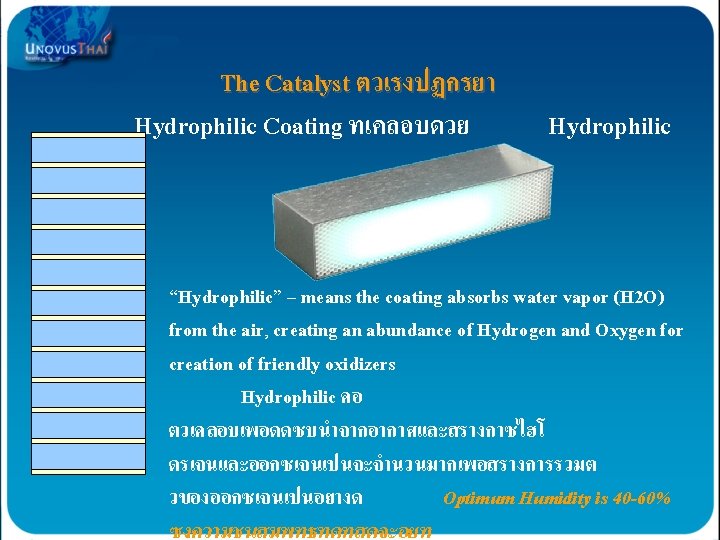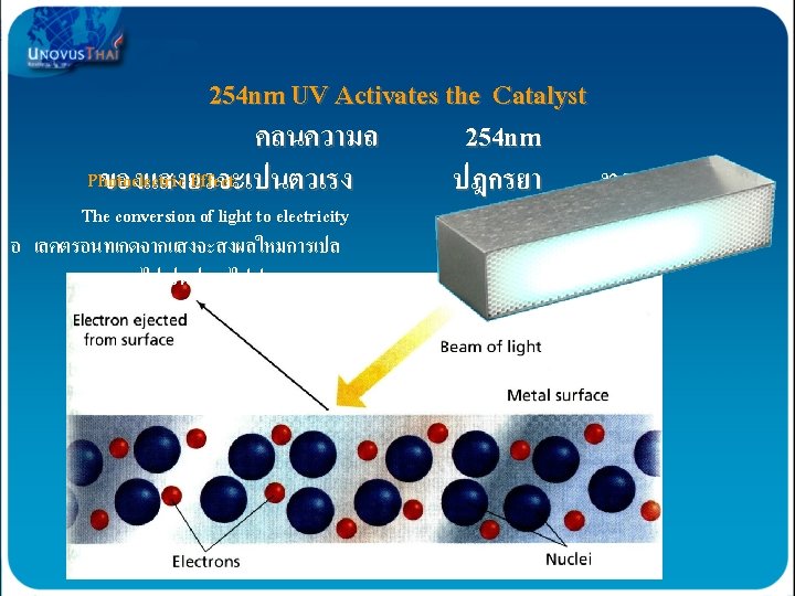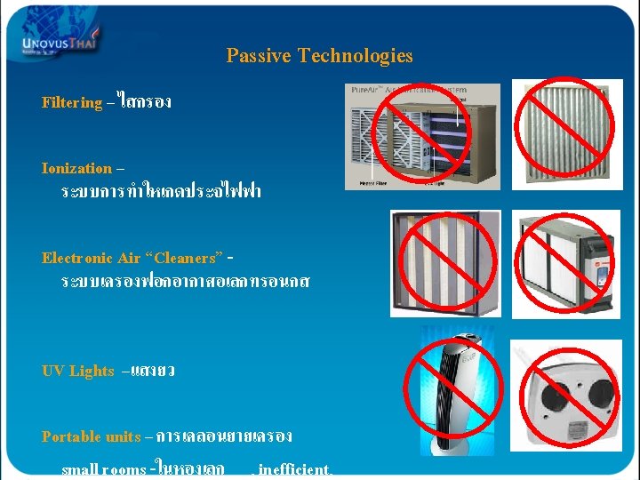 AOP formation of “Friendly Oxidizers” AOP เปนการสรางการรวมตวของสารทมประโยชนตอรางกายเ รา OHO 2 0 OH These oxidizers are then picked up in- the air stream and dispersed throughout the building Hydroxyl Radicals O 3 การรวมตวของสารจะเกดขนตอเมอมการไหลเวยนของอากาศเพอแยกอากาศดและอากาศเสยออกจากกน …ACTIVELY purifying contaminants! Hydroxides OH 0 OH H 2 O 2 O 30 OH O 3 - O 2 OH- Super Oxides O 2 Hydrogen Peroxide H 2 O 2 Ozonide Ions O 3 Ozone O 3 Broad Spectrum UV Light