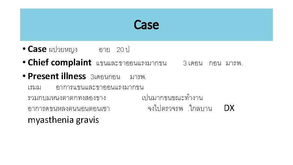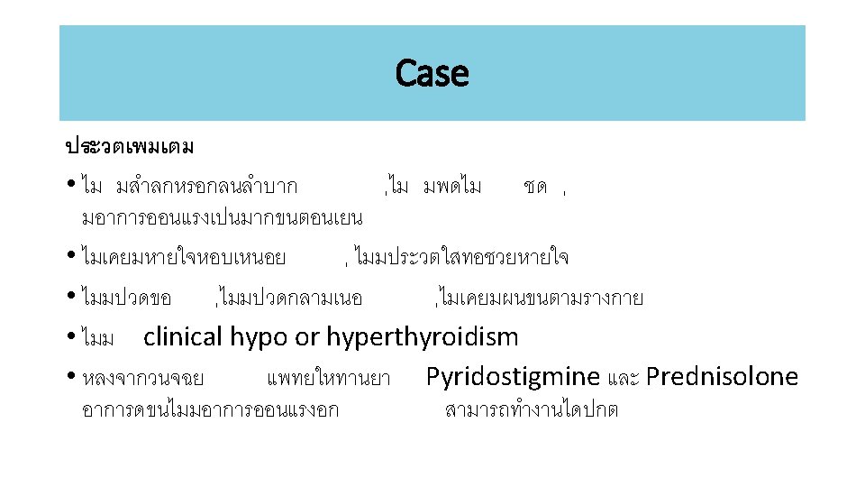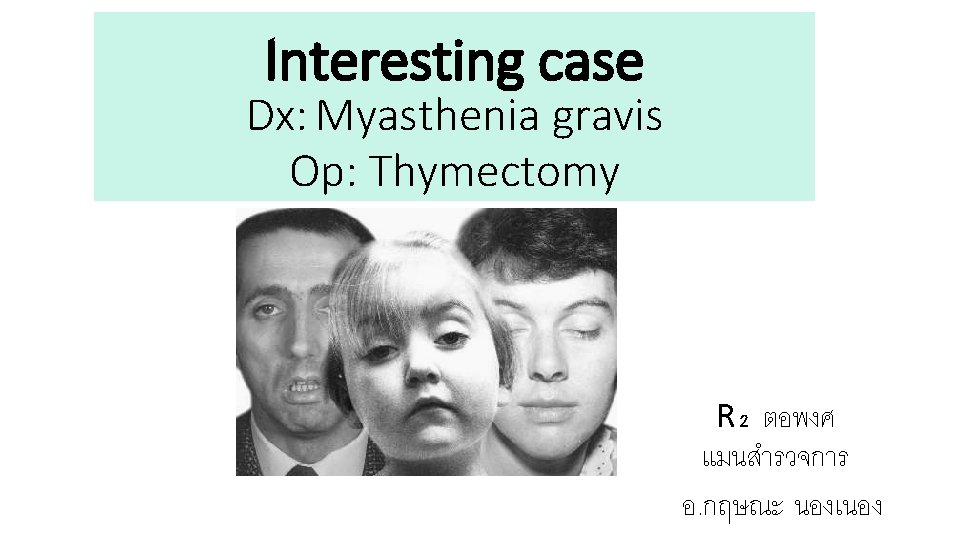 Post operative(day 1) S : ตนด ไมม n/v ไมมหอบเหนอย ปวดแผล O: BT 37. 2 PR 80 BP 120/ 80 RR 18 pain score 6 -8 A+P: MG: continue Mestinon(60)1*4 Pain control : Mo 4 mg iv prn q 4 hrs, Fentanyl Patch 25 mcg/Hr Tramol(50) 1 tab O prn q 6 hrs. GU : I/O 1372/1390 GI : soft diet Neuromuscular: no muscle weakness Respiratory : clear both lung, breathing exercise Hemato : Hct 40 Vol%