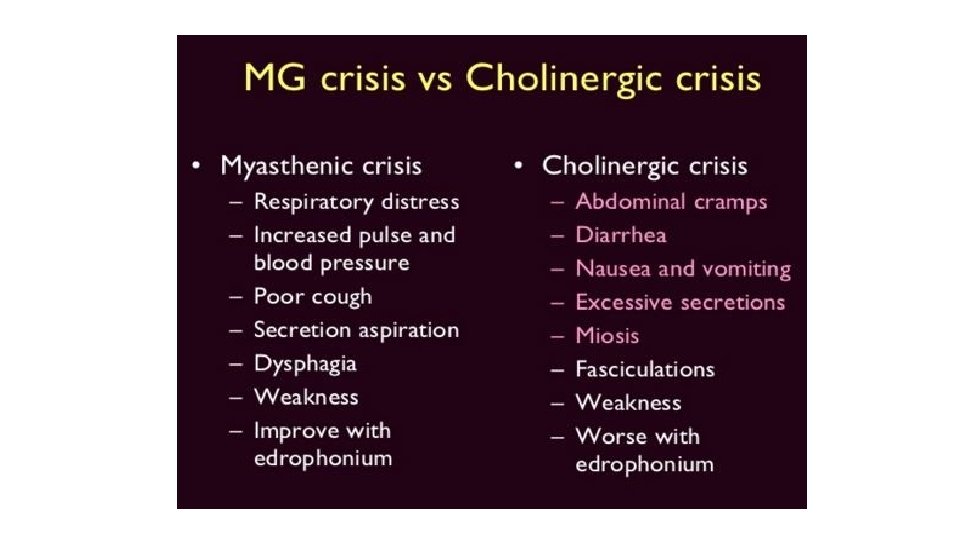 Cholinergic crisis • Cholinergic crisis results from an excess of cholinesterase inhibitors • flaccid muscle paralysis • Miosis • SLUDGE syndrome (salivation, lacrimation, urinary incontinence, diarrhoea, GI upset and hypermotility, emesis)