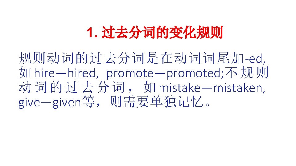 3. 过去分词的语法作用 (1) 过去分词作定语 e. g. These are the required courses for senior high school students. The novel written by him is very popular. 2 was written by him is 1 = The novel which/that very popular. 过去分词作后置定语时可以改为相应的定语从句。