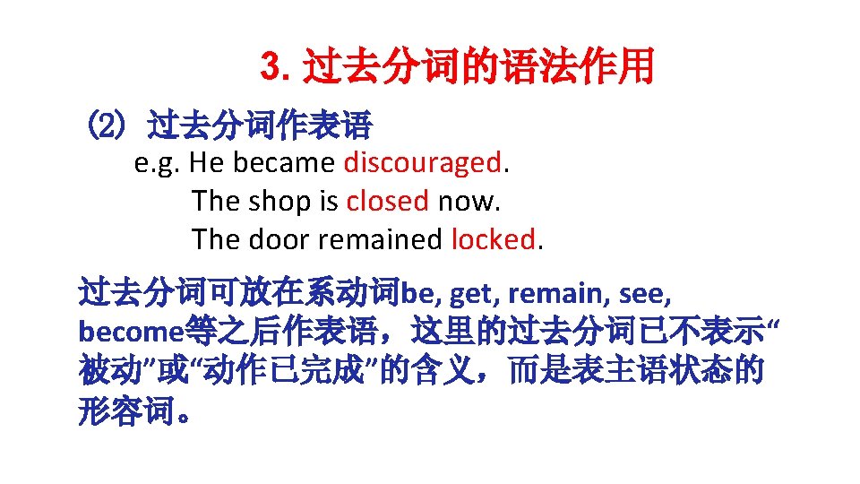 过去分词的语法功能 1. 过去分词作定语 The novel written by him is very popular. = The novel which/that was written by him is very popular. 过去分词作后置定语时可以改为相应的定语从句。 2 过去分词作表语 The shop is closed now. The door remained locked.