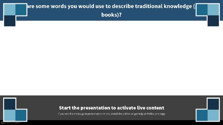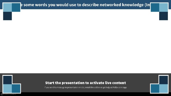 The Evolution of Knowledge Traditional knowledge Networked knowledge Medium: paper Physically bound, linear Institutional, top-down Expert Settled Ordered Difficult to scale Filters out One-way (focused on a single voice) Curated Medium: Internet Boundary-free Populist, Inclusive Other-credentialed Unsettled Messy Scalable Filters forward Conversational Decentralized ------ Lives at the level of the individual Lives at the level of the network