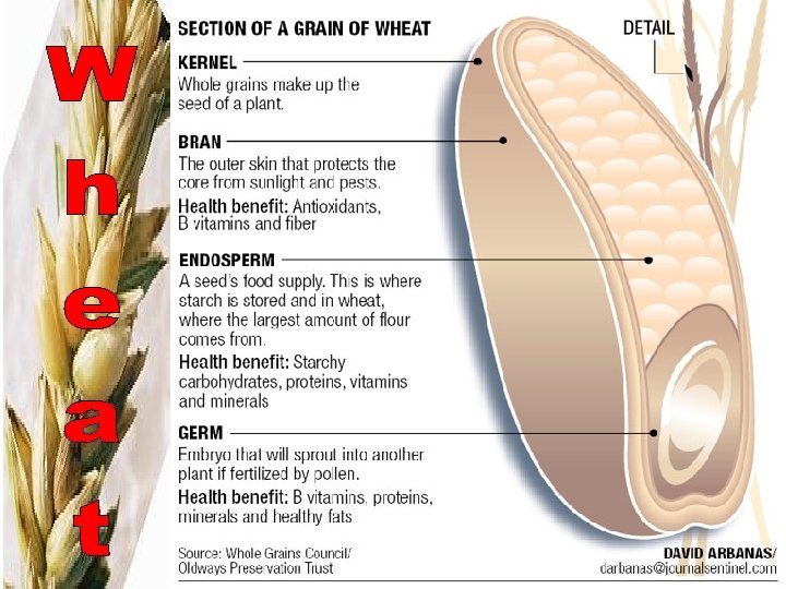 Parts of the Grain • _______ - outside covering of the grain and consists of several layers. • _________ - is the inner white portion. – complex carbohydrates , proteins, NO vitamins and minerals • ______ - found at one end of the kernel, is the sprouting part from which a new part grows. – (B vitamins, vitamin E, iron, zinc, other minerals, unsaturated fat)