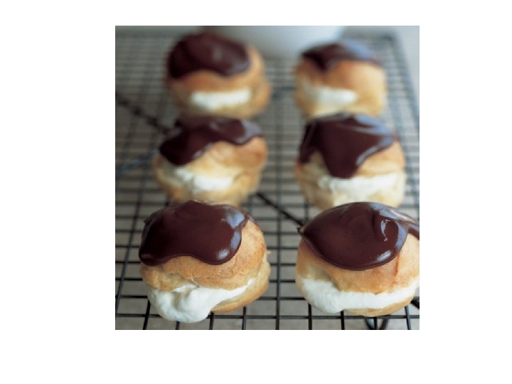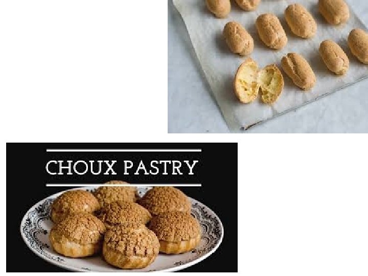 Choux pastry • Choux pastry is a very light pastry that is often filled with cream. Unlike other types of pastry, choux is in fact closer to a dough before being cooked which gives it the ability to be piped into various shapes such as the éclair. Its name originates from the French choux, meaning cabbage, owing to its rough cabbagelike shape after cooking. Choux begins as a mixture of milk or water and butter which are heated together until the butter melts, to which flour is added to form a dough.
