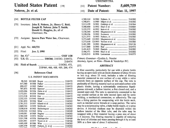 In part, the independent claims at issue in the '759 patent state: 1. A filter assembly for use with a bottle having a circular cross-section neck or open end to simultaneously cap the neck or open end and filter liquid poured out of the bottle through the neck or open end, comprising: a tube of filtering material. . . a cap. . . said cap having first and second substantially opposite surfaces. . . a manual valve operatively associated with said cap, in fluid communication with said tube of filtering material and manually movable between a position defining means for allowing liquid flow through said tube and a position defining means not allowing liquid flow through said tube; and said tube operatively connected to said cap second surface at said tube second open end. .