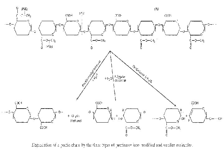 q. Pectic substances which form basic material of middle lamella, primary and secondary walls are degraded by pectinolytic enzymes. The Pectinolytic enzymes act against pectin and pectic substances in many steps: (a)The enzymes pectin methyl esterases (PME) hydrolyse the pectic substances into methanol and pectic acid. (b) The enzymes pectin glycosidases, polygalacturonases (PG) and polymethyl galacturo nases (PMG) degrade the pectic acid and methylated chains of pectin. Besides these, wall modifying enzyme (WME) modifies the pectic material for subsequent degrada tion.