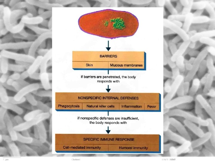 The human body has three lines of defense against microbial attack: External barriers – skin and mucous membranes 1. intact skin acts as a barrier to entry and is inhospitable to microbial growth – dry, dead skin does not contain moisture necessary for microbial growth and most will be ejected when skin cells are constantly soughed off – skin is protected by secretions from sweat and sebaceous glands that contain natural antibiotics (lactic acid) that inhibit microbial growth