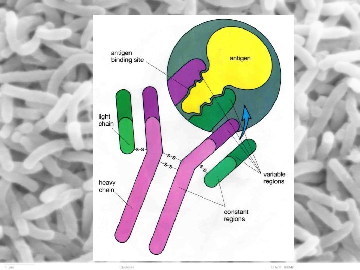 Antibodies • • • large proteins that are either attached to the surfaces of B cells or dissolved in the blood plasma (these are called immunoglobins, abbreviated Ig) – recognize and attach to foreign antigens Y – shaped molecules made of 4 polypeptides (2 “heavy” chains and two “light” chains) antibodies have two sites that stick out and constantly look for antigens (and attach to antigens) and one site that sticks to the surface of its lymphocyte antibodies act in two ways: 1) act as receptors and bind to antigens triggering a response, and 2) act as effectors and circulate in bloodstream neutralizing poisonous antigens and destroying microbes bearing antigens tips of antibodies form highly specific binding sites for antigens – each site has a specific shape and binds only to a specific type of antigen