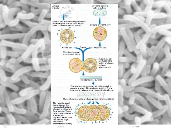 Monoclonal antibodies • antibodies of the same type produced by cloning in the laboratory – antibodies are useful for many medical and scientific purposes • antigen is injected into animal and resulting plasma cells (antibody factories) are extracted and merged with a myeloma (cancer) cell to form a hybridoma (plasma cells will not divide outside the body but cancer cells will) • hybridomas divide under laboratory conditions and produce the desired antibodies – monoclonal antibodies • because they are specific for a particular antigen, can be used for a number of purposes in diagnosis and treatment of disease
