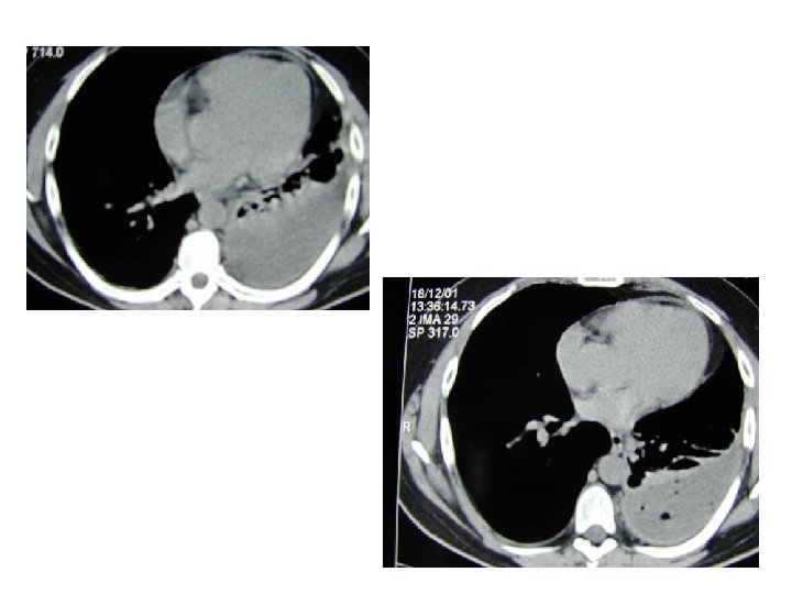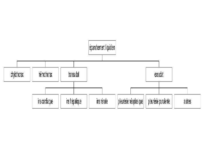Diagnostics • p° pleurale • aspect macroscopique (hémorragique, chyleux, purulent…) • transsudat / exsudat transsudat exsudat Prot pleurales/prot sériques < 0, 5 > 0, 5 LDH pleurales/LDH sériques < 0, 6 > 0, 6 LDH pleurales <2/3 lim sup du taux normal LDH sériques >2/3 Prot pleuraux < 30 g/l > 30 g/l Leucocytes pleuraux < 1000/mm 3 > 1000/mm 3