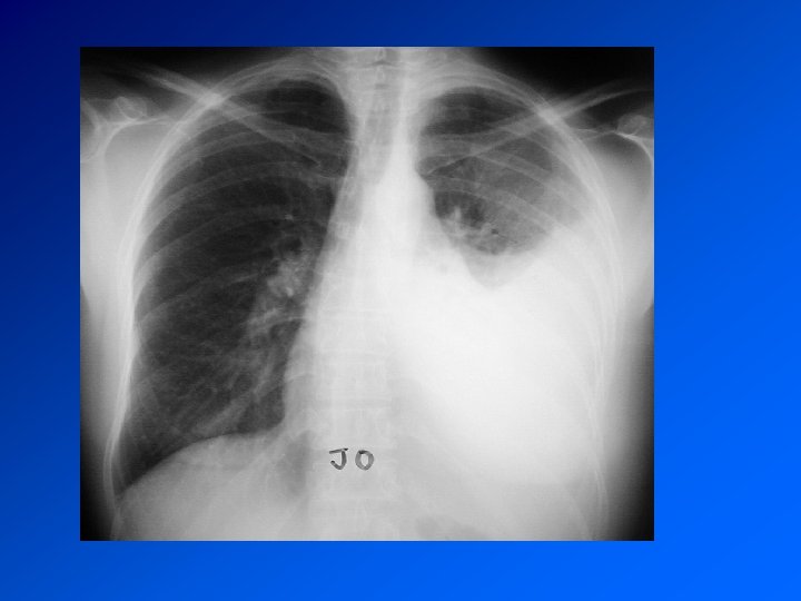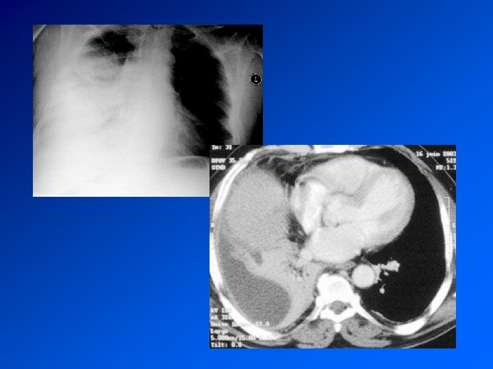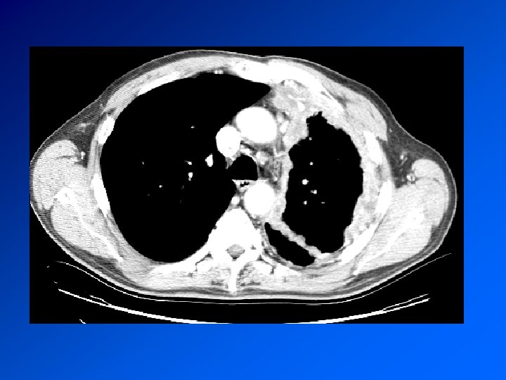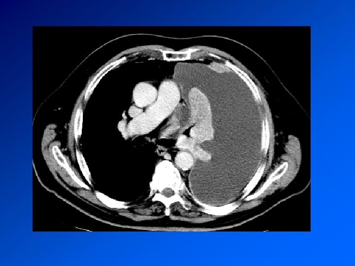Mésothéliome pleural Cancer primitif de la plèvre Principal facteur de risque (retrouvé dans > 80% des méso): exposition à l’AMIANTE CDD : AEG douleur, syndrome pleural. Surveillance d’un sujet exposé Radio : pleurésie. Epaississement tumoral nodulaire de la plèvre. Extension extrathoracique rare mais possible Evolution défavorable. Survie moyenne 9 à 12 mois. Traitement décevant : chimiothérapie. Radiothérapie sur orifices biopsies et drainage Symphise pleurale