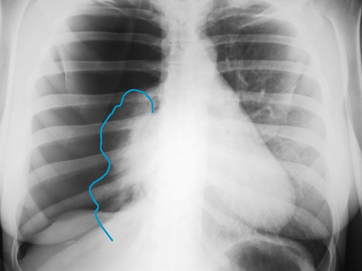 PNT spontanée du sujet jeune Le pneumothorax est lié à la rupture de bulles d’air sous -pleurales. CDD : douleur thoracique brutale spontanée ou lors d’un effort. Parfois dyspnée Examen : tympanisme hémithoracique. Recherche de signes de détresse respiratoire (polypnée, cyanose, sueur, tirage…) Radio : hyperclarté périphérique séparée du poumon par le « liséré capillaire » : image de la plèvre viscérale. La radio fait le diagnostic