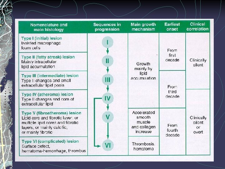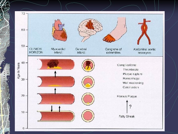 Diseases of arterias B. Atherosclerosis The complicated lesions are defined by: a) patchy or massive calcification, b) focal rupture or gross ulceration, c) thrombus formation (thrombosis) producing emboli, d) hemorrhage into a plaque, e) aneurysmal dilatation of large vessels.