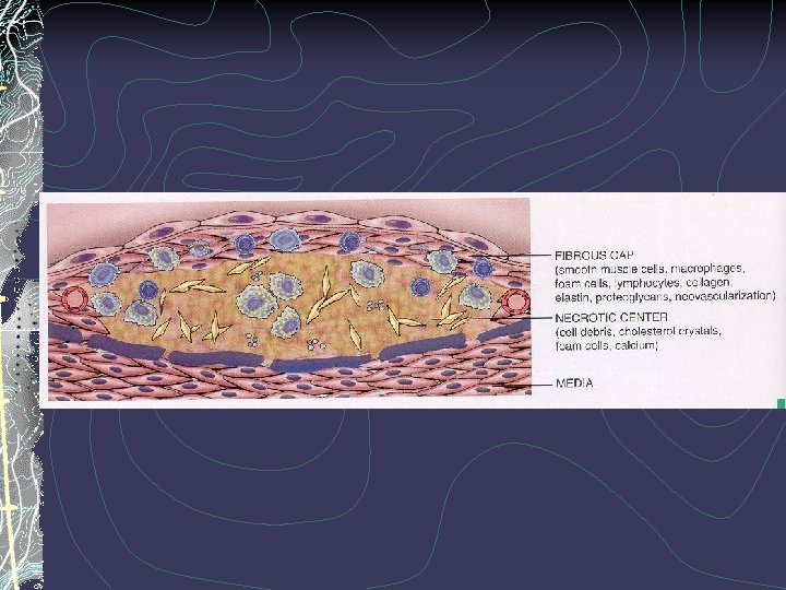 Diseases of arterias B. Atherosclerosis Atheromatous plaques are the basic lesions within the intima, having a core of lipid (mainly cholesterol and cholesterol esters) and a covering fibrous cap. APs are also called fibrous, fibrofatty, lipid, or fibrolipid plaques which have white to whitish yellow colour and rise intima slightly into the lumen of the artery. The centers of larger plaques may contain a yellow debris, hence the term atheroma. Their distribution in humans is characteristic. The abdominal aorta is usually much more involved than thoracic aorta, and aortic lesions tend to be
