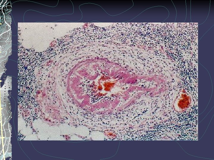 Diseases of arterias D. Inflammatory Disease – Arteritides, Vasculitides Medium-Sized Vessel Vasculitis Polyarteritis nodosa: Necrotizing inflammation without glomerulonephritis or vasculitis in arterioles, capillaries, or venules. Kawasaki disease: Arteritis associated with mucocutaneous lymph node syndrome. Coronary arteries are often involved. Aorta and veins may be involved. Usually occurs in children. Thromoangitis obliterans (Buerger disease): Segmental, thrombosing acute and chronic inflammation of mediumsized and small arteries, principally the tibial artery in