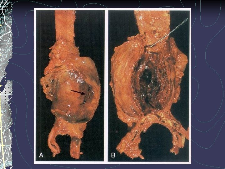 Diseases of arterias F. Aneurysms and Dissection Aortic Dissection (Dissecting Hematoma) – is characterized by dissection of wall and penetration of blood in between and along the laminar planes of the media, with the formation of a blood-filled channel within the aortic wall – a dissecting intramural hematoma (aneurysm). It can rupture, causing massive hemorrhage. In contrast to atherosclerotic and syphilitic aneurysms, it is not usually associated with marked dilatation of the aorta. The more common and dangerous proximal lesions involving either the ascending postion of aorta only or both the ascending and the descending aorta are called types I and II of De. Bakey´s classification (often called type A). Distal lesions not involving the ascending part of aorta and