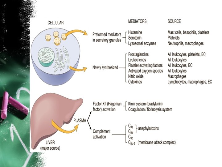 2. Plasma Mediators (proteases). Sources: from three circulating systems in the plasma of blood & synthesis in liver. These systems are, I. Kinin system. Activation of this system will result in formation of Bradykinin, which is protein has the same action of histamine, in addition it causes pain. This system is inactivated by Kinase.