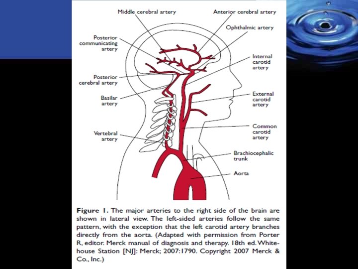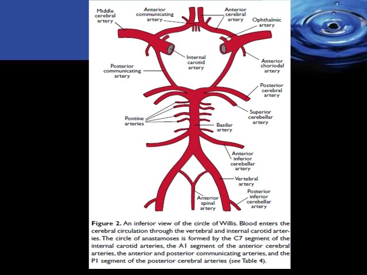 Anatomy of Cerebral Circulation v. Blood Supply v 20% of cardiac output— 750 -1000 ml/min v>30 second interruption– neurologic metabolism is altered; metabolism stops in 2 minutes; brain cell death < 5 mins.