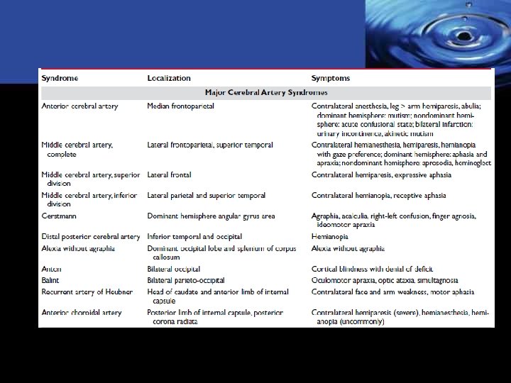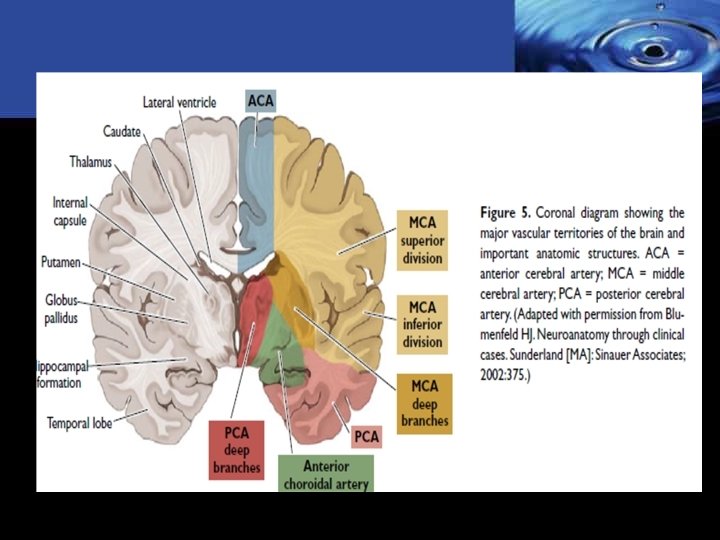 Occlusion of the anterior cerebral artery • • • Cortical branches supply the medial surface of the hemisphere: Orbital, frontal, and parietal ctx. Deep branches pass to the anterior part of the internal capsule and basal nuclei. Clinical features depend on the site of occlusion (especially in relation to the anterior communicating artery) and anatomical variation. Occlusion proximal to the ACom. A is normally well tolerated because of the cross flow. Distal occlusion results in weakness and cortical sensory loss in the contralateral lower limb with associated incontinence. Bilateral frontal lobe infarction may result in akinetic mutism or deterioration in conscious level.