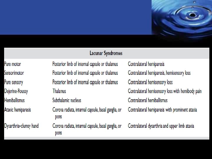 Lacunar stroke • • • Occlusion of deep penetrating arteries produces subcortical arction characterised by preservation of cortical function – language, other cognitive and visual functions. Clinical syndromes are distinctive and normally result from long -standing hypertension. In 80%, infarcts occur in periventricular white matter and basal ganglia, the rest in cerebellum and brainstem. Areas of infarction are 0. 5 -1. 5 cm in diameter and occluded vessels demonstrate lipohyalinosis, microaneurysms and microatheromatous changes. Lacunar or subcortical infarction accounts for 17% of all thromboembolic strokes and knowledge of commoner syndromes is essential.