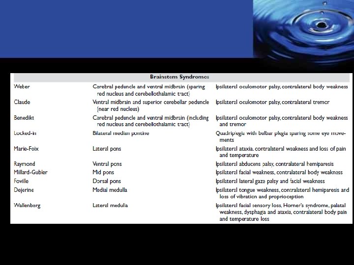 Basilar artery occlusion • • • The basilar artery supplies the brainstem from medulla upwards and divides eventually into posterior cerebral arteries which run forward to join the anterior circulation (circle of Willis). Clinical features: Prodromal symptoms are common and may take the form of diplopia, visual field loss, intermitent memory disturbance and a whole constellation of other brainstem symptoms: vertigo, ataxia, paresis, paraesthesia. The complete basilar syndrome following occlusion consists of: Coma, bilateral motor and sensory dysfunction, cerebellar signs and cranial nerve signs. Very serious condition!