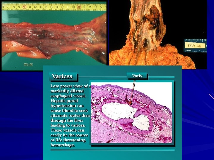 Varices Portal hypertension collateral bypass channels (wherever the portal and caval systems communicate) The increased pressure in the esophageal plexus produces dilated tortuous vessels called varices. Two-thirds of all cirrhotic patients and are most often associated with alcoholic cirrhosis. No symptoms until they rupture. Massive hematemesis