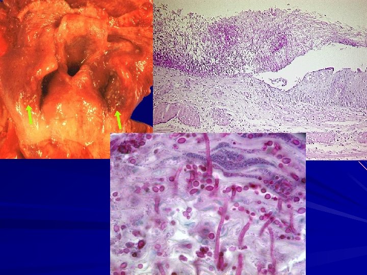 Candida albicans Superficial, curdy, gray to white inflammatory membrane composed of matted organisms fibrinosuppurative exudate with an underlying erythematous inflammatory base Risk factors: – Diabetes mellitus, – neutropenia, – immunoincompetent, – AIDS, – Xerostomia, antibiotic therapy.