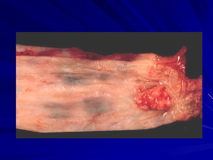 Squamous cell carcinoma – Usually preceed by epithelial dysplasia and carcinoma in situ, – Early lesions: small, gray-white mucosal thickenings, – Three forms: 1. Polypoid exophytic 2. Necrotizing-ulcerative 3. Diffuse infiltrative Localization: – Upper upper third (20%) – Middle third (50%) – Lower third (% 30).