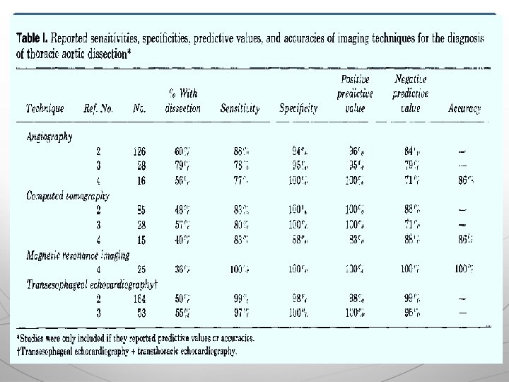 Initial management of patients with suspected aortic dissection Recommendation ECG: documentation of ischemia Heart rate and blood pressure monitoring Pain relief (morphine sulfate) Reduction of systolic blood pressure with ß-blockers (intravenous metoprolol, esmolol, or labetelol) In patients with severe hypertension despite ß-blockers, additional vasodilator (intravenous sodium nitroprusside to titrate blood pressure to 100– 120 mm Hg) In patients with obstructive pulmonary disease, blood pressure lowering with calcium channel blockers Imaging in patients with ECG signs of ischemia before thrombolysis if aortic pathology is suspected Chest x-ray Class I I II II III All recommendations are level of evidence аdapted from Reference 43, by permission of Oxford University Press.