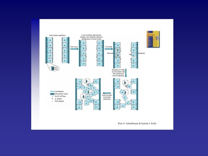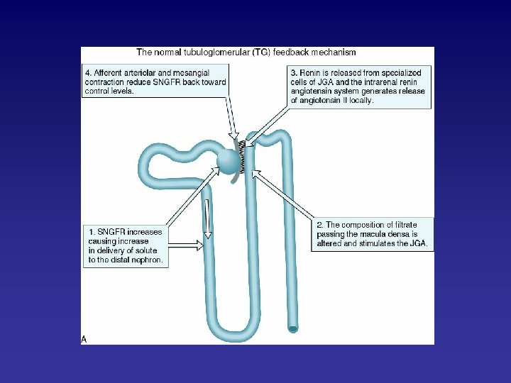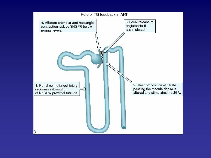 • Epithelial cell injury per se cause secondary renal vasoconstriction by a process termed tubuloglomerular feedback: – specialized epithelial cells in the macula densa region of distal tubule detect increases in distal tubule salt delivery due to impaired reabsorption by proximal nepron segments and in turn stimulate constriction of afferent arterioles