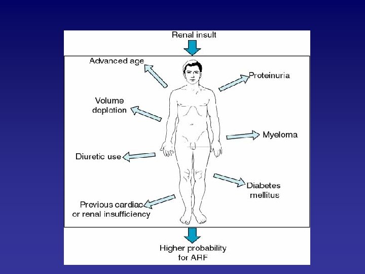 Major causes of prerenal ARF 2. Low cardiac output • • Diseases of myocardium, valves, and pericardium, arrhytmias, tamponade Other: pulmonary hypertension, pulmonary embolus 3. Increased renal systemic vascular esistance ratio • • • Systemic vasodilatation: sepsis, vasodilator therapy, anesthesia, anaphylaxis Renal vasoconstriction: hypercalcemia, norepinephrine, epinephrine Cirrhosis with ascites