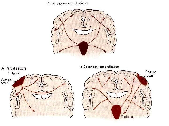 • The onset of a seizures appears to occur when a small group of abnormal neurons undergo prolonged depolarizations associated with the rapid firing of repeated action potentials. • These abnormally discharging epileptic neurons recruit adjacent neurons or neurons with which they are connected into the process. • A clinical seizure occurs when the electrical discharges of a large number of cells become abnormally linked together, creating a storm of electrical activity in the brain. • Seizures may then spread to involve adjacent areas of the brain or through established anatomic pathways to other distant areas.