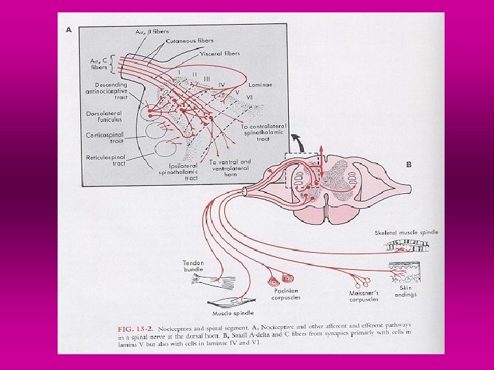 The role of the spinal cord in pain processing • Most of afferent pain fibers terminate in the DH of the spinal segment that they enter. Some, however, extend toward the head or the foot for several segments before terminating • The A- fibers, some large A-delta fibers and small C- fibers terminate in the laminae of dorsal horn and in the substantia gelatinosa (SG) • The laminae than transmit specific information (about burned or crushed skin, about gentle pressure) to 2 nd afferent neuron