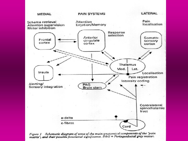 PAG – periaqueductal gray PB – parabrachial nucleus in pons VMpo – ventromedial part of the posterior nuclear complex MDvc – ventrocaudal part of the medial dorsal nucleus VPL – ventroposterior lateral nucleus ACC – anterior cingulate cortex PCC – posterior cingulate cortex HT – hypothalamus S 1, S 2 – first and second somatosensory cortical areas PPC – posterior parietal complex SMA – supplementary cortical areas AMYG – amygdala PF – prefrontal cortex