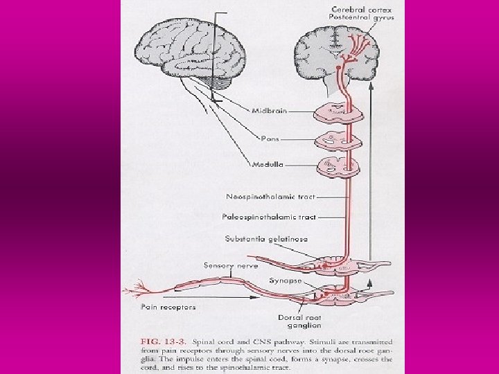 • 2 nd afferent neurons transmit the impulse from the SG and laminae through the ventral and lateral horn, crossing in the same or adjacent spinal segment, to the other side of the cord. From there the impulse is carried through the spinothalamic tract to the brain. The two divisions of spinothalamic tract are known: 1. the neospinothalamic tract - it carries information to the mid brain, thalamus and post central gyrus (where pain is perceived) 2. the paleospinothalamic tract - it carries information to the reticular formation, pons, limbic system, and mid brain (more synapses to different structures of brain)