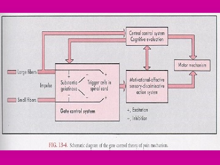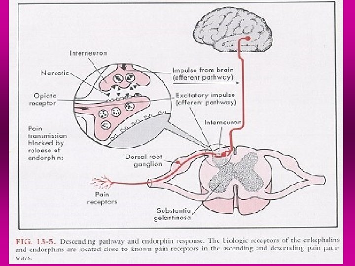 ØStimulation of small fibers input inhibits cells in SG and "open the gate". • An open gate increases the stimulation of T-cells transmission of impulses enhances pain perception • In addition to gate control through large and small fibers stimulation, the central nervous system, through efferent pathways, may close, partially close, or open gate , too. Cognitive functioning may thus modulate pain perception Action of endorphins(ED) All ED act by attaching to opiate receptors on the plasma membrane of the afferent neuron. The result than is inhibition of releasing of the neurotransmitter, thus blocking the transmission of the painful stimulus