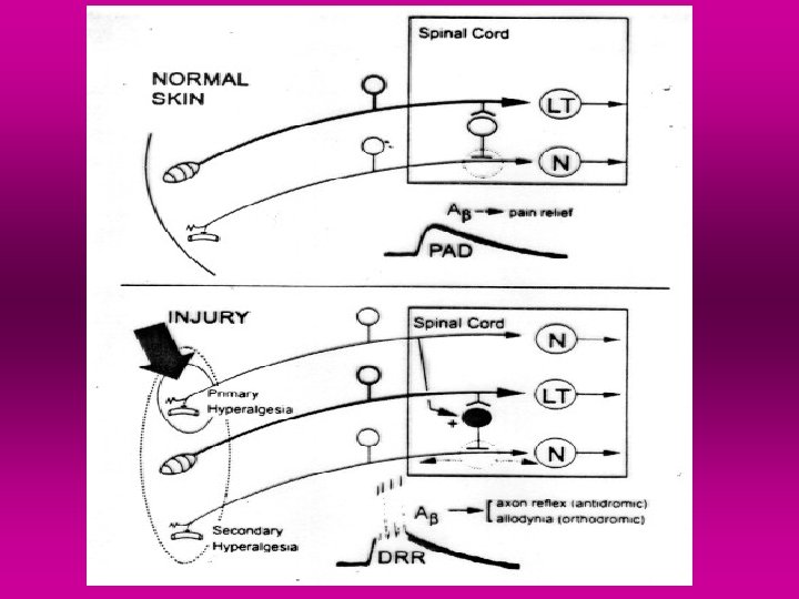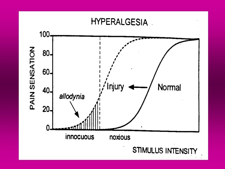 • Hypersensitivity – increased sensitivity of the system involved in the pain processing • Hyperalgesia – increased the pain sensitivity to noxious stimuli Allodynia - phenomenon characterised by painful sensations provoked by non-noxious stimuli, (e. g. touch), transmitted by fast- conducting nerve fibres Mechanism: changes of the response characteristics of second - order spinal neurons, so that normally inactive or weak synaptic contact mediating non-noxius stimuli acquire the capability to activate a neuron that normally responds only to impulses signaling pain
