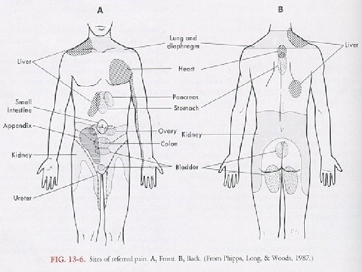 Clinical Manifestation of Pain Acute Pain We can distinguish two types of acute pain: 1. Somatic 2. Visceral – referred Somatic pain is superficial coming from the skin or close to the surface of the body. Visceral pain refers to pain in internal organs, the abdomen, or chest. Referred pain is pain that is present in an area removed or distant from its point of origin. The area of referred pain is supplied by the nerves from the same spinal segment as the actual site of pain
