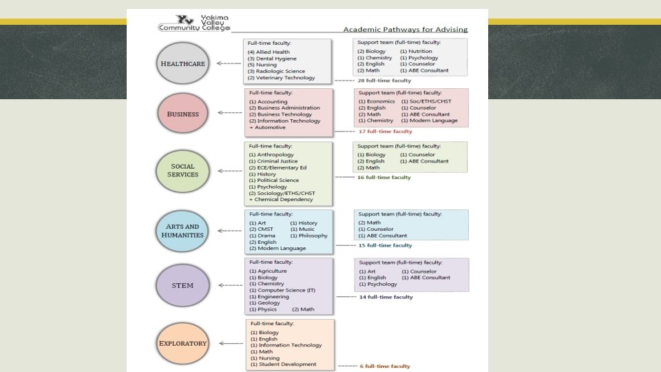YVCC Pathway Advising Leadership/Management VP Of Instruction & Student Services Dean of Arts & Sciences Dean of Workforce Education Dean of Student Services Dean of Adult Basic Education Pathway Leads: Arts & Humanities STEM Pathway Leads: Business Healthcare Pathway Leads: Exploratory Pathway Leads: Social Sciences & Education Faculty Advising Lead Yakima Registrar Director of Technology Services Community Relations Faculty Advising Lead Grandview