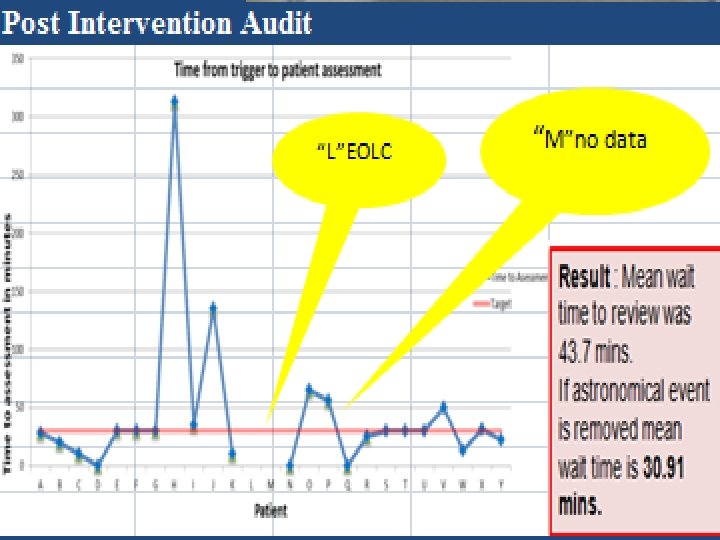 Driver Diagram Secondary Drivers Primary Drivers - Executive management board engagement. - Involve staff to embrace and grow a culture of Safety and Quality Improvement in relation to Sepsis. - Continuous Improvement through Clinical Leaderships/Governance and Champions working towards a shared goal. - Education of Multidisciplinary team. - Honest/transparent measurement of performance delivered monthly to EMB. Building a Patient Safety Culture Result : Mean wait time to review was 43. 7 mins. If astronomical event is removed mean wait time is 30. 91 mins. - Use NEWS and National Sepsis Screening tool to quickly identify the patient with Sepsis to standardise approach. - Competency/skills to recognise the Sepsis Patient. Prompt Recognition - Education/empowerment of ward staff re prompt communication to NCHD and escalation if no response to ensure patients are seen by a Doctor within the recommended time frame. - Develop standardise processes and clarity of roles. Timely Diagnosis - Ensure delivery of the Sepsis 6 within the 1 st hour and continually monitor the patient to deliver the 3 hr and 6 hr bundle. - Dedicated Sepsis consumables to hand. Early Intervention - Review case studies and root cause analysis of events. - Ensure feedback to all the team. Continuous Learning (