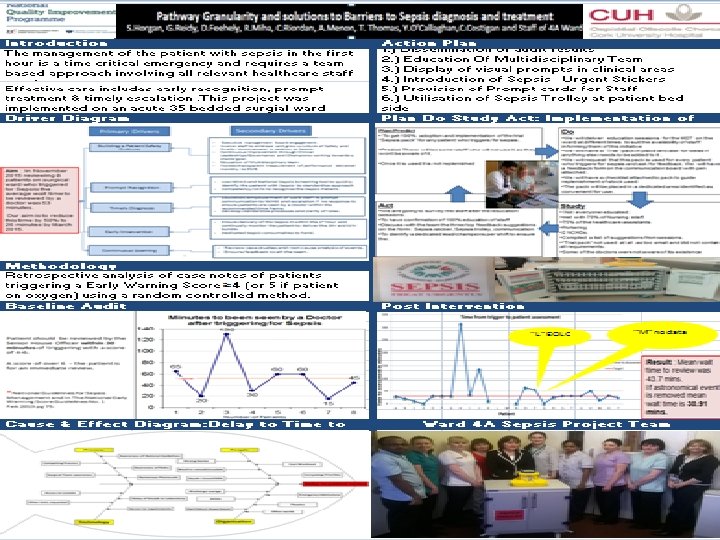 CUH SEPSIS Project Team – – – Sinéad Horgan and Grace Reidy Project sponsor Dr Ken Walsh – Perioperative Clinical Director Clinical lead Dr Dorothy Breen, Medical Lead Sepsis Deirdre Feehely, Assistant Director of Nursing Perioperative Directorate Roxana Mihu NCHD Amudha Madhavan CNM 2 Staff Nurses Healthcare Assistants Yvonne, Titus and Martha Claire Costigan, CNM 2 for the Deteriorating patient Representation from Portering & laboratory. Ciara O’Riordan, Ward Pharmacist. Kelly Mc Carthy, Biomedical Scientist