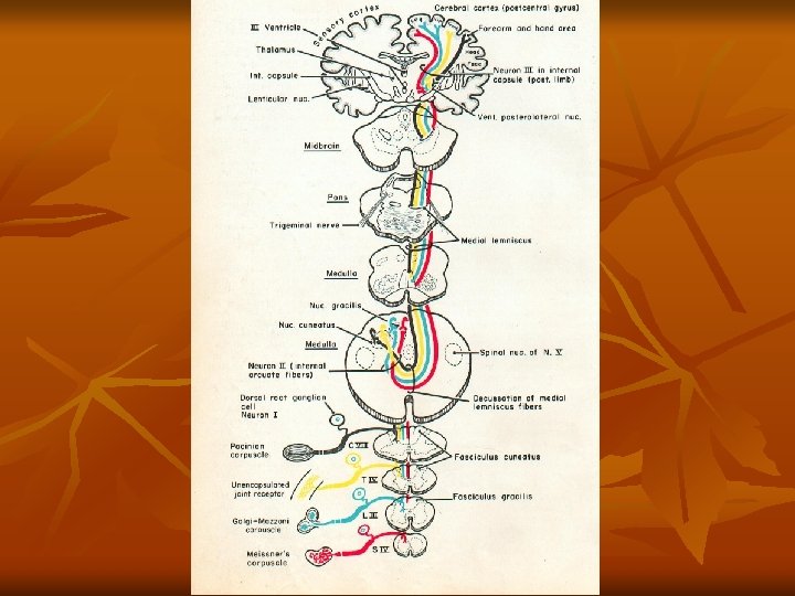 ANTERIOR SPINOTHALAMIC TRACT(crossed) (touch&pressure) n n n Dorsal rootganglion )neuron I) spinal cord(II) Fibers of this tract cross in the anterior white commissure and ascend in the anterior funiculus. On reaching brainstem levels its fibers join the medial lemniscus and relay to the VPL(III). Brodmann 3, 1, 2 (center)