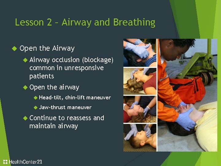 Lesson 2 – Airway and Breathing Open the Airway occlusion (blockage) common in unresponsive patients Open the airway Head-tilt, chin-lift maneuver Jaw-thrust Continue maneuver to reassess and maintain airway