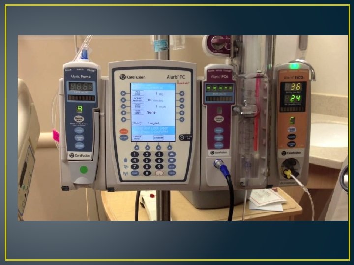 Perks of PCA • Don’t have to bother nurse • Don’t have to wait for med administration process (five rights, narc counts, waiting for machine, nurse interruptions, signing into computer and scanning) • Faster action • It takes less meds to prevent pain than to treat it • Don’t need food (but will probably need an antiemetic)