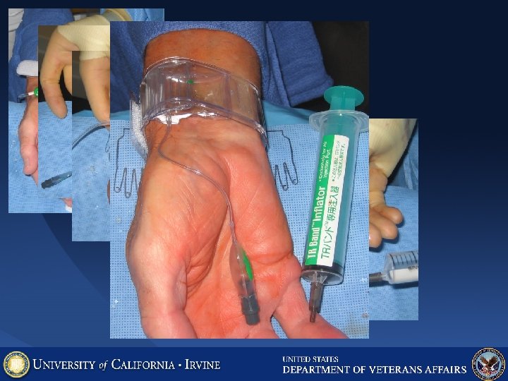 Typical TR band protocol • • Withdraw sheath 2 -3 cm from vessel Apply band with green marker over puncture site Inflate 15 -18 cc air using Inflator Remove sheath Deflate band until bleeding is observed, inflate 2 cc additional to ensure hemostasis Check distal radial pulsation or oximetry Tape TR band syringe to patient Deflate band in 2 hours (diagnostic cath) or 4 hours (PCI) and remove. Progressive deflation unnecessary. Reinflate if bleeding occurs.