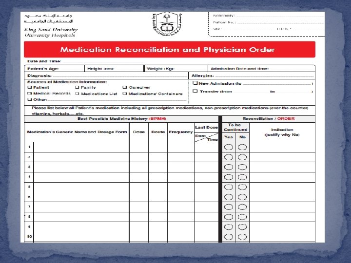 3 -Medication reconciliation At admission, transfer and discharge 4 - Safe surgical practice Surgical safety check list Pre-operative verification Pre- operative marking Time out prior to procedure 5 -Dangerous abbreviations - New