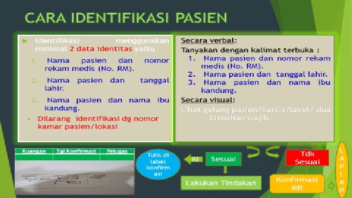 � Semua pasien harus diidentifikasi dengan benar mulai dari pendaftaran sampai dengan pasien pulang � Sebelum memberikan layanan (pemberian obat, darah, produk darah, pemberian diet khusus tersaji di baki (penampan), atau pemberian radio terapi. � Sebelum tindakan (seperti menerima cairan intravenous atau hemodialisis). � Sebelum dilakukan setiap tindakan prosedur diagnostik (seperti pengambilan darah atau pengambilan spesimen lain untuk pemeriksaaan klinik, katerisasi jantung, atau prosedur radiologi diagnostic Alat Identifikasi : Karcis, gelang identitas, id card, label